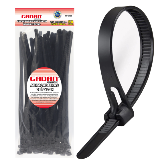 ABRAÇADEIRA DE NYLON REUTILIZÁVEL 7,6X250MM C/ 50UN. PRETA - GADAN